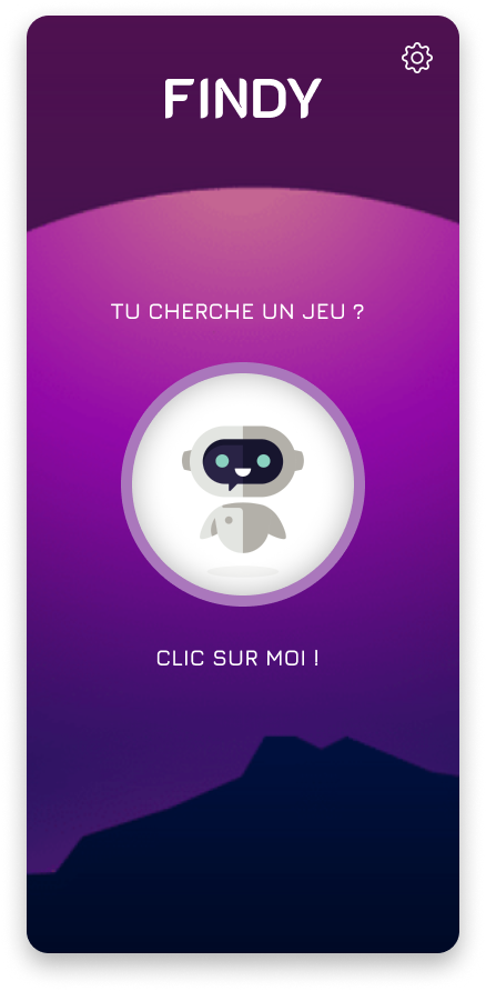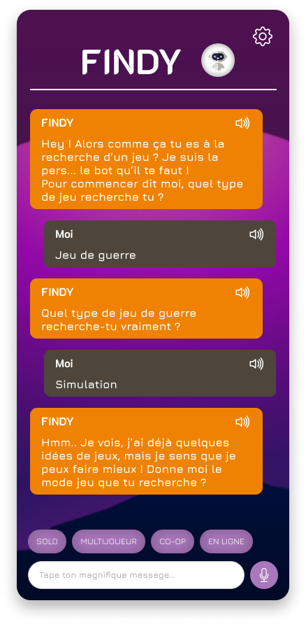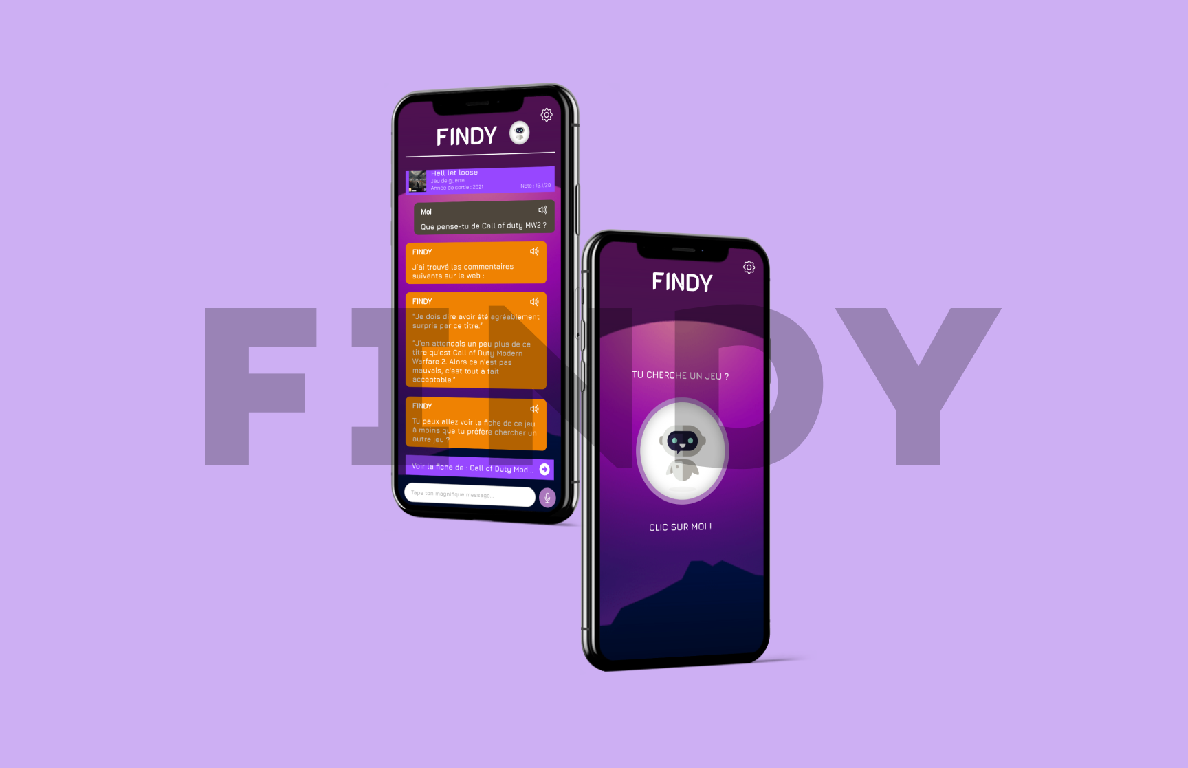 La phase de recherche finalisé, je me suis attelé aux wireframes en low-fidelity pour me une donner une idée imagé de mes idées et vérifié que tout s’imbriquait correctement. J’ai poursuivi sur la définition des couleurs à adopter et du nom que je souhaitais donner à l’application. Pour les couleurs j’ai choisi de prendre le violet pour représenter le côté application (les résultats de recherche) tandis que le orange est attribué aux réponses du bot. Ces couleurs étant opposé, cela permet au premier coup de voir quels sont les messages du système avec les proposition de jeu ou les messages du bot. Ces deux couleurs déjà contrasté permet de faire une distinction avec les messages de l’utilisateurs en gris. Pour ce qui est du nom de l’application je suis parti sur le principe de donner un nom au bot/mascotte de l’application. Depuis le début du projet j’avais en tête un slogan pour l’application : “Find you a new game”, ainsi pour le nom j’ai pris le début de mon slogan, de plus je voulais que le nom représente la recherche, le verbe “Find” était donc très adapté, j’y ai ajouté un “Y” pour rappeler le reste du slogan.