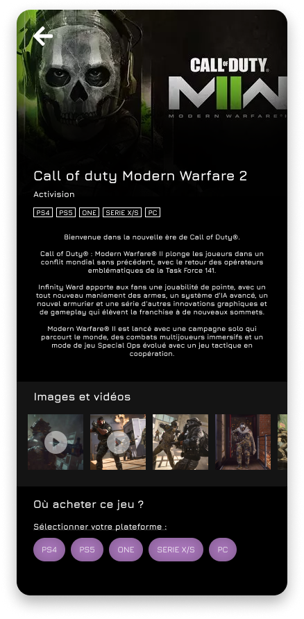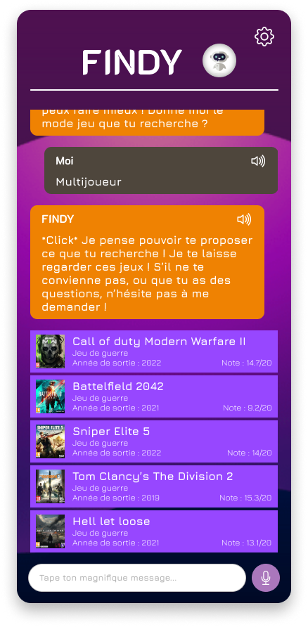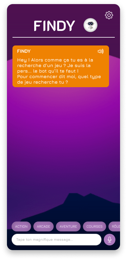 Application type chatbot pour découvrir des jeux vidéos en discutant avec un bot personnalisable.